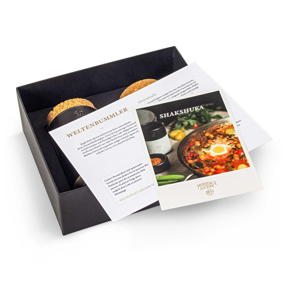 Abgerundet wird das Präsent durch eine edle, plastikfreie Verpackung sowie einen hochwertig gedruckten Beileger (deutsch/englisch) mit Gewürzwissen und eine passende Rezeptkarte (deutsch) – so ist das Präsent sofort bereit zum Überreichen.