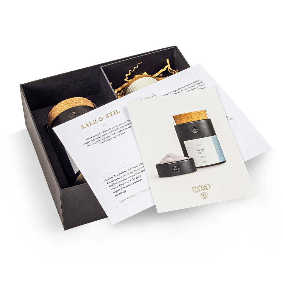 Geschenkbox Salz & Stil mit Blausalz und weißer Scape Salzmühle als edles Gourmet Geschenkset.