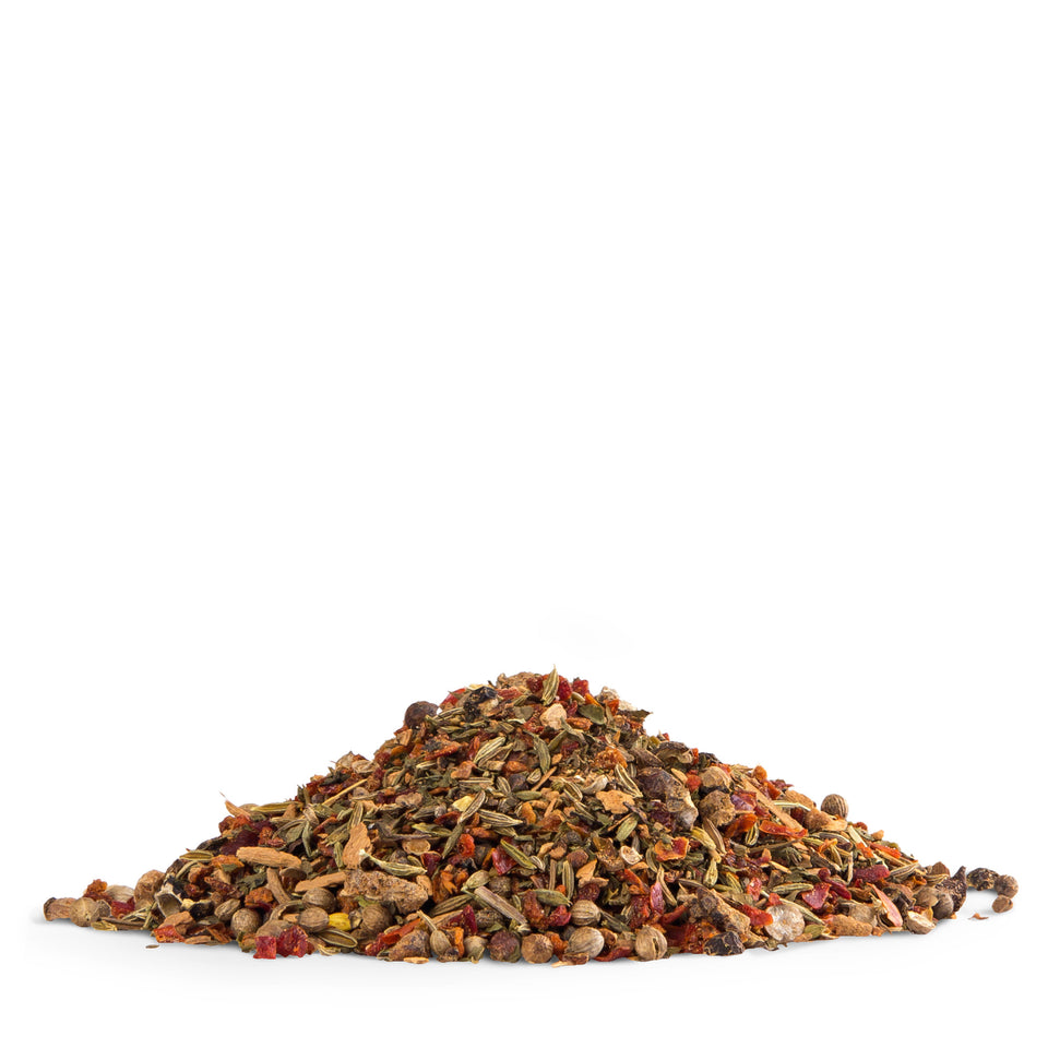 Paprika, Kreuzkümmel, Stangenpfeffer, Schwarzer Pfeffer, Koriandersaat, Gewürznelke, Muskatnuss, Ceylon-Zimt, Minze, Kubebenpfeffer, Cardamom