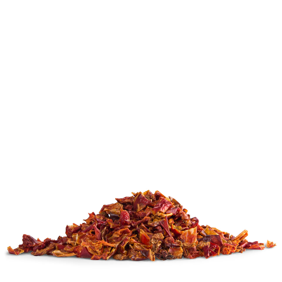 Anders als das überall erhältliche, gemahlene Paprikapulver wird unsere Paprika nach dem Trocknen nur geschnitten. So bleiben die Zellwände größtenteils erhalten und schließen weiterhin die wertvollen Aroma- und Farbstoffe ein. Die Aromen von Paprika sind fettlöslich, weshalb man sie vor der Verwendung in ein wenig Öl andünsten kann. Unsere Paprika enthält noch viel Restfeuchte, deshalb kann man sie auch in einer Pfanne trocken rösten, danach zerstoßen und mit dem selbst hergestellten, frischen Pulver würzen.