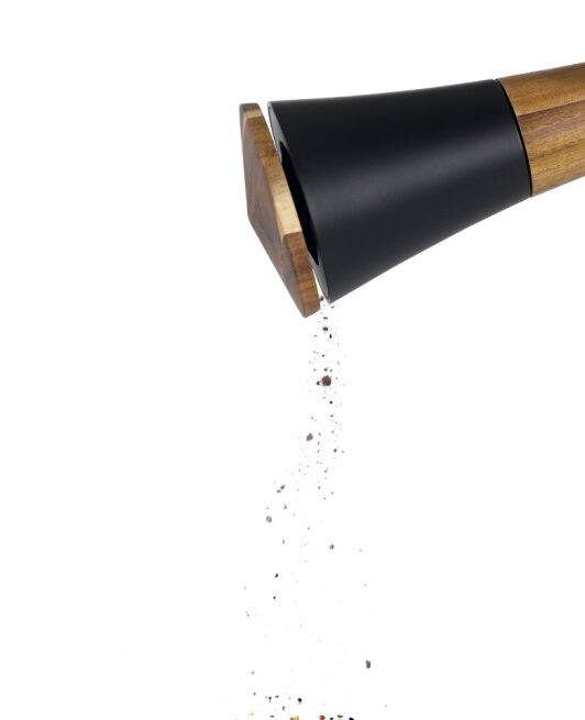 Diese Kreiselmühle hat einen kegelförmigen Boden. Gleichzeitig dient der Boden auch als Mahlwerkabdeckung und Einstellscheibe für das patentierte Ceramic Mahlwerk CeraCut®, welches sowohl rost- als auch verschleißfrei ist und zuverlässig entweder Salz oder Pfeffer zerkleinert. Salz oder Pfeffer können je nach Mahlgrad unterschiedlich groß zerkleinert werden. Die hohe Qualität des Mahlwerks und die robuste Verarbeitung garantieren eine lange Lebensdauer und Freude an der Mühle. Sie ist aus Kunststoff und Akazienholz gefertigt und hat das patentierte Ceramic Mahlwerk CeraCut®. Die Mühle hat einen Durchmesser von 8,5 cm und eine Höhe von 18,5 cm.